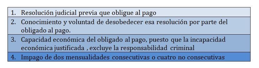 “El que dejare de pagar durante dos meses consecutivos o cuatro meses no consecutivos cualquier tipo de prestación económica a favor de su cónyuge o sus hijos, establecida en convenio judicialmente aprobado o resolución judicial en los supuestos de separación legal, divorcio, declaración de nulidad del matrimonio, proceso de filiación, o proceso de alimentos a favor de sus hijos, será castigado con la pena de prisión de tres meses a un año o multa de seis a 24 meses”